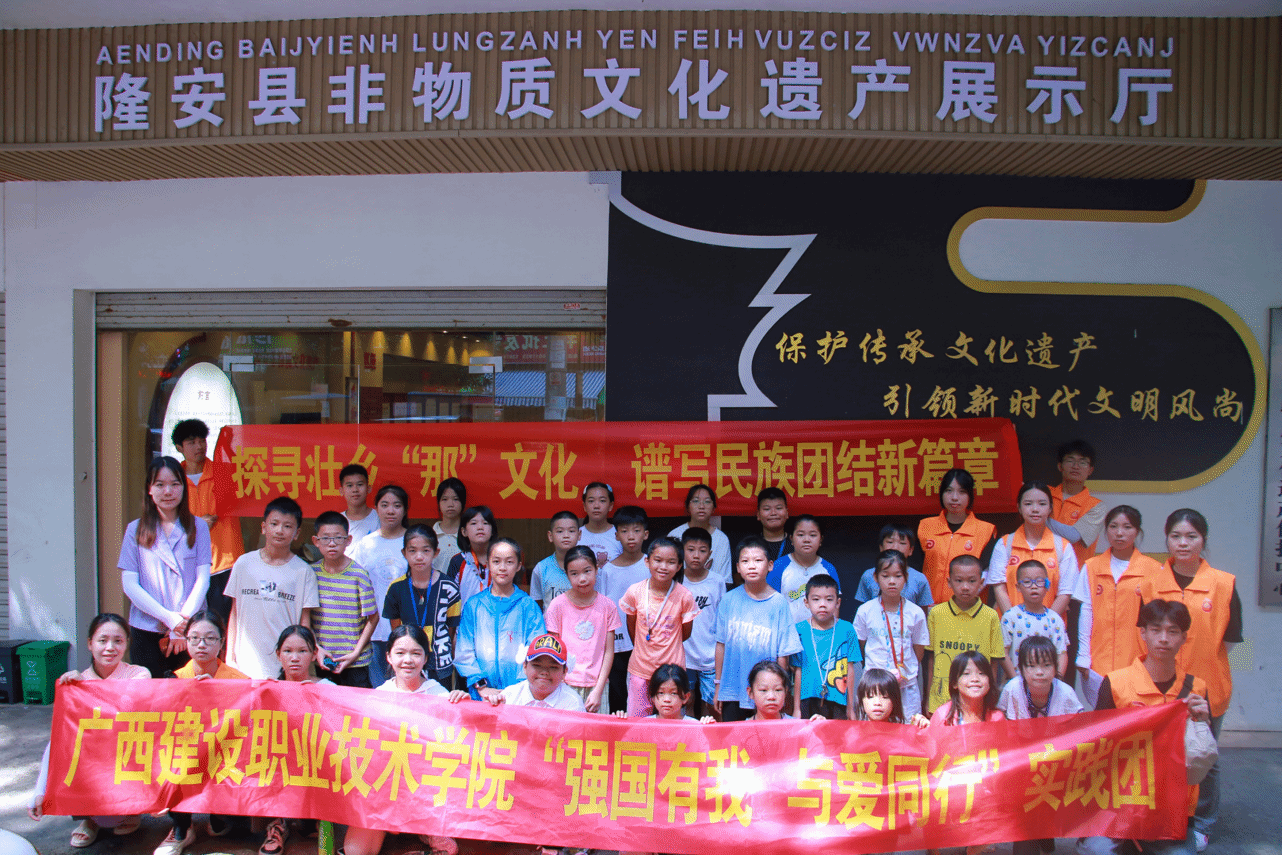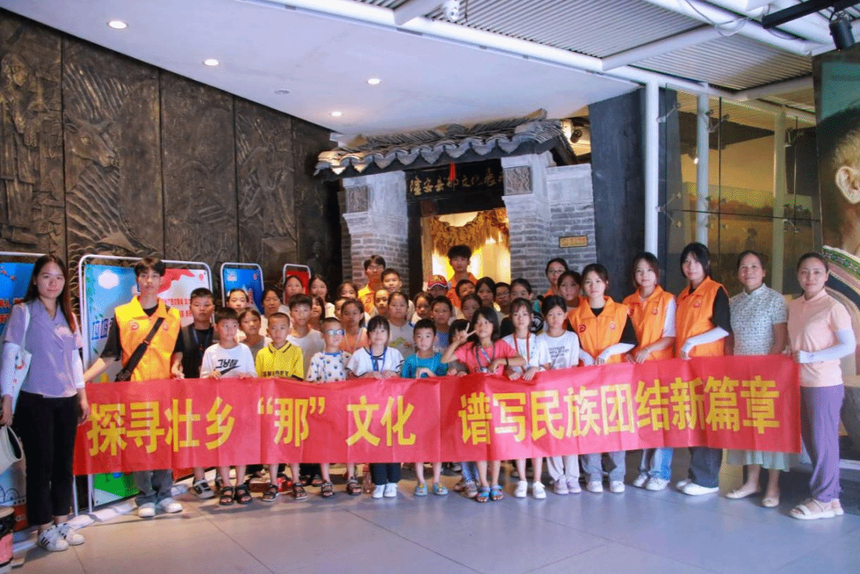 實(shí)踐團(tuán)成員和小朋友們參觀結(jié)束后在隆安縣非物質(zhì)文化遺產(chǎn)展示廳合影