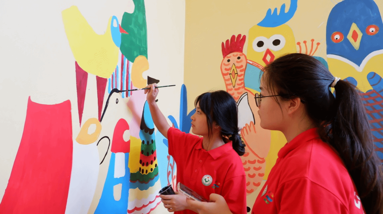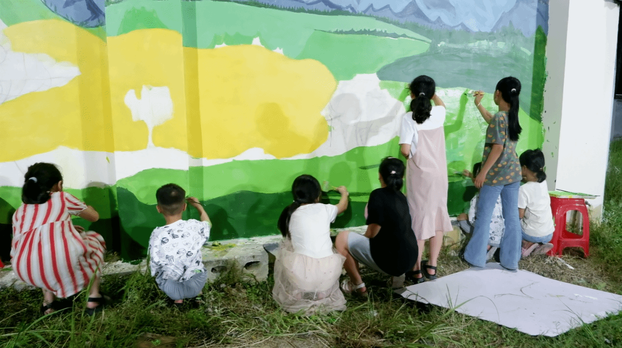 經過連日的努力,實踐團圓滿完成了河池市南丹縣六寨社區(qū)黨群服務中心外面約60平米的墻畫繪制。同時,實踐團還應當地苗苗幼兒園的需求,為幼兒園樓梯墻面等繪制了充滿童趣的卡通形象墻,為幼兒園開展美育教育營造了良好的氛圍。