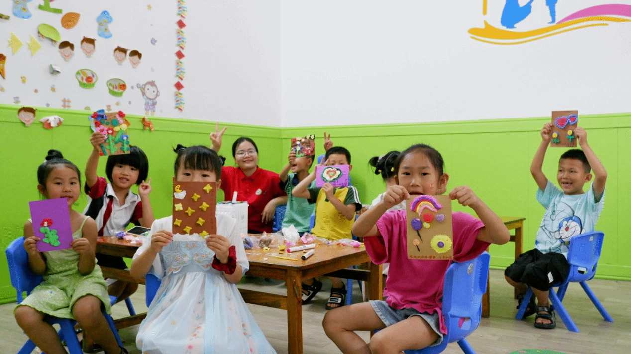 大手牽小手,小朋友們在實踐團隊的幫助下,制作完成了一件件充滿童趣的手工作品。作品中有花草樹木,有海底生物,有七彩斑斕的彩虹,也有一閃一閃的小星星。孩子們高舉自己的作品,臉上洋溢著燦爛的笑容,在相機里留下難忘的瞬間。實踐團隊員們也被孩子們的快樂感染,所有的疲憊,在這一刻消失殆盡。