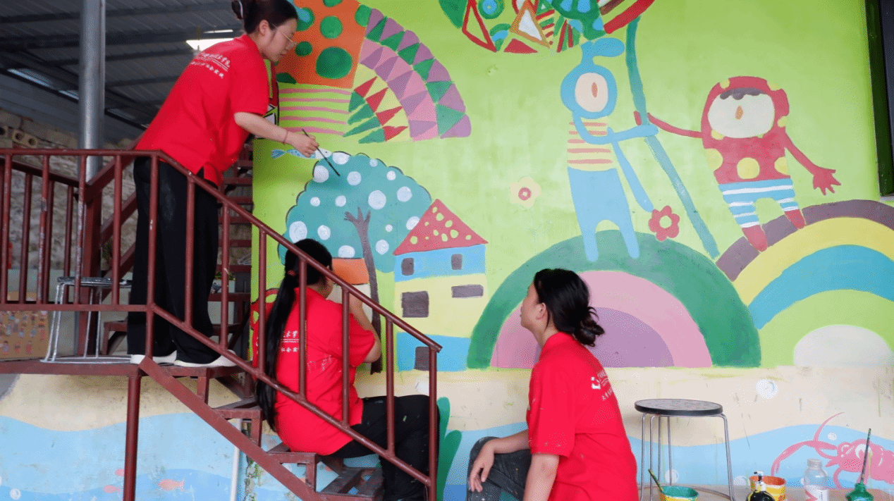 “繪美鄉村”實踐團為南丹縣六寨鎮苗苗幼兒園繪制樓梯墻面