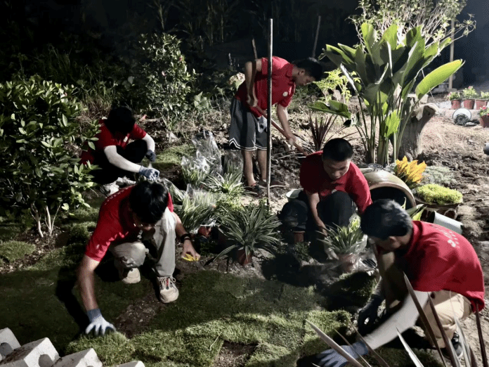 伴著皎潔的月光,隊(duì)員們加緊施工。面對(duì)工期短、任務(wù)重、溫度高的實(shí)際情況,他們充分利用夜晚時(shí)間,挖坑種樹(shù),運(yùn)石鋪地,繼續(xù)施工作業(yè),只為保質(zhì)保量完成施工任務(wù)。