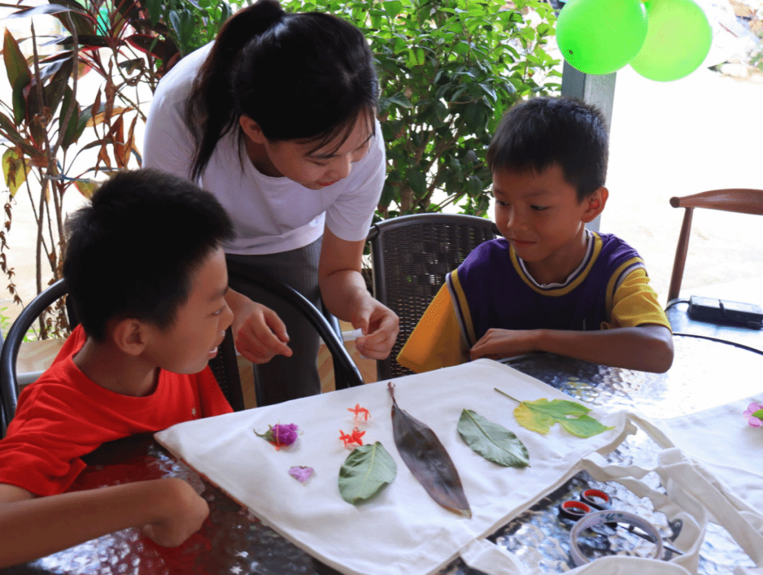 實踐團成員與三江坡兒童一起做環(huán)保手工