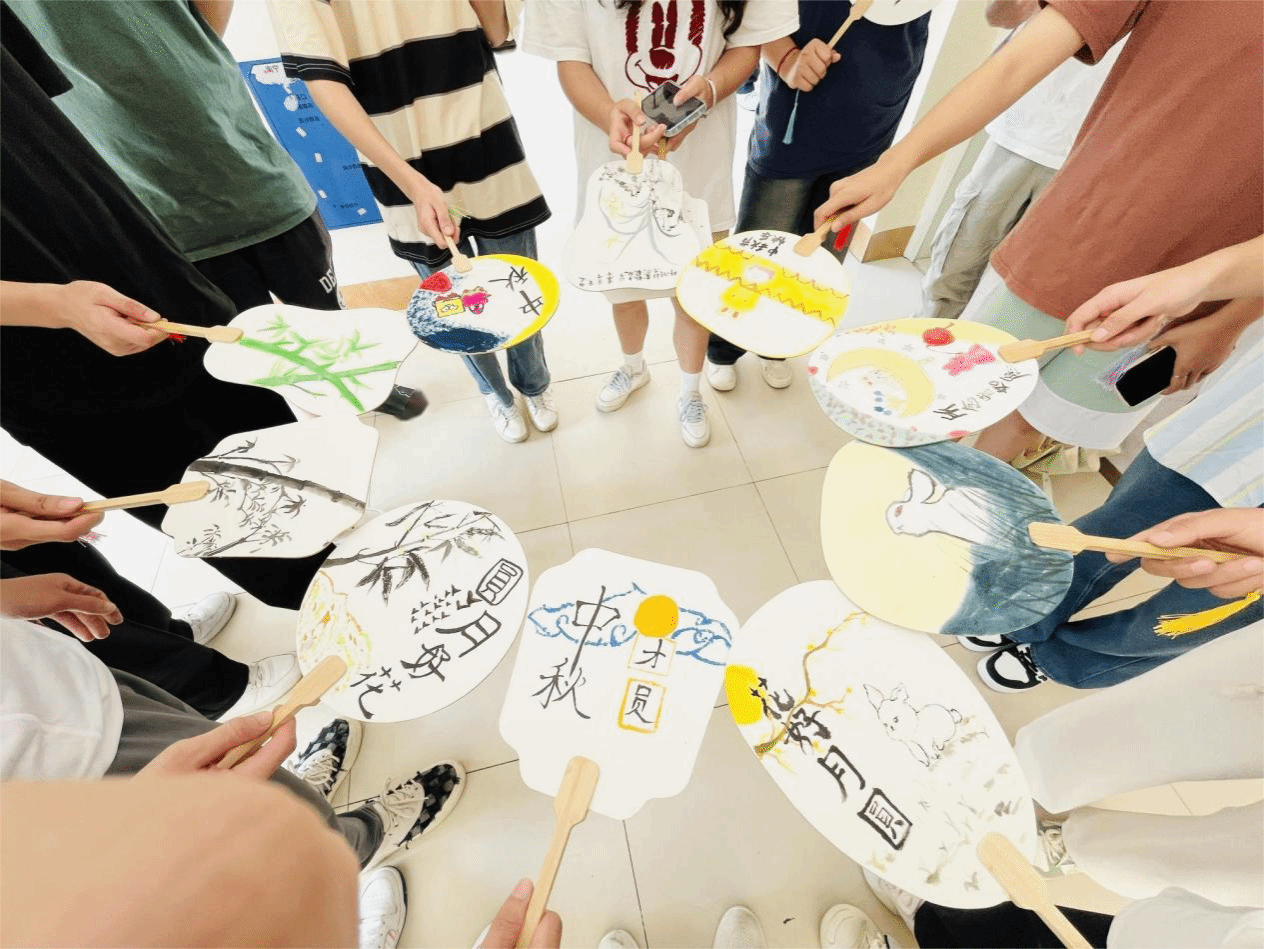 巧繪團扇,藝樂中秋——團扇繪畫。團扇是中國傳統手工藝品,凝結了中華傳統文化內涵,蘊含“團圓”之意。制作活動中,老師重點向同學們介紹了團扇蘊含的豐富文化內涵,并悉心指導同學們進行團扇繪畫。原本素白的扇面在同學們的筆下,成為一幅幅精彩吉祥的畫卷,一面面飽含美好心愿、清新淡雅的團扇作品。