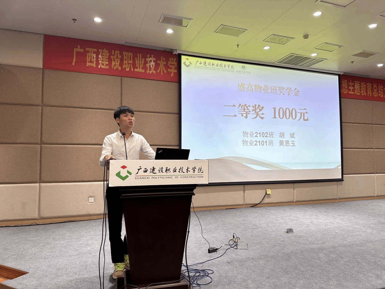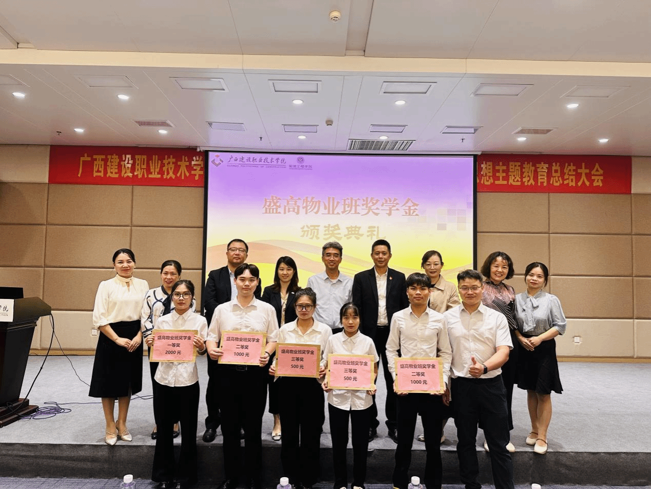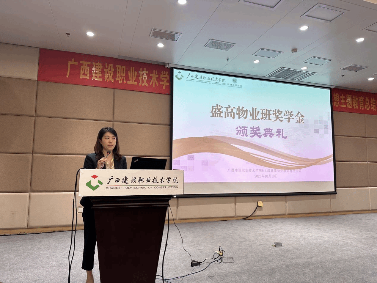 廣西建院10月11日訊(管理工程學院 張鈺棠)10月10日晚,盛高物業班獎學金頒獎儀式在學校四教一樓報告廳順利舉行。上海盛高物業服務有限公司人力中心總監季雪、人力中心高級經理林晨,上海盛高物業服務有限公司南寧中心城市總經理徐敏智、綜合部經理王芳,管理工程學院代端明副院長(主持行政工作)、羅輝副院長、現代物業管理專業教學團隊負責人黃娟老師,以及專業教師代表出席了頒獎典禮,現代物業管理專業2022級、2023級全體同學參加典禮。