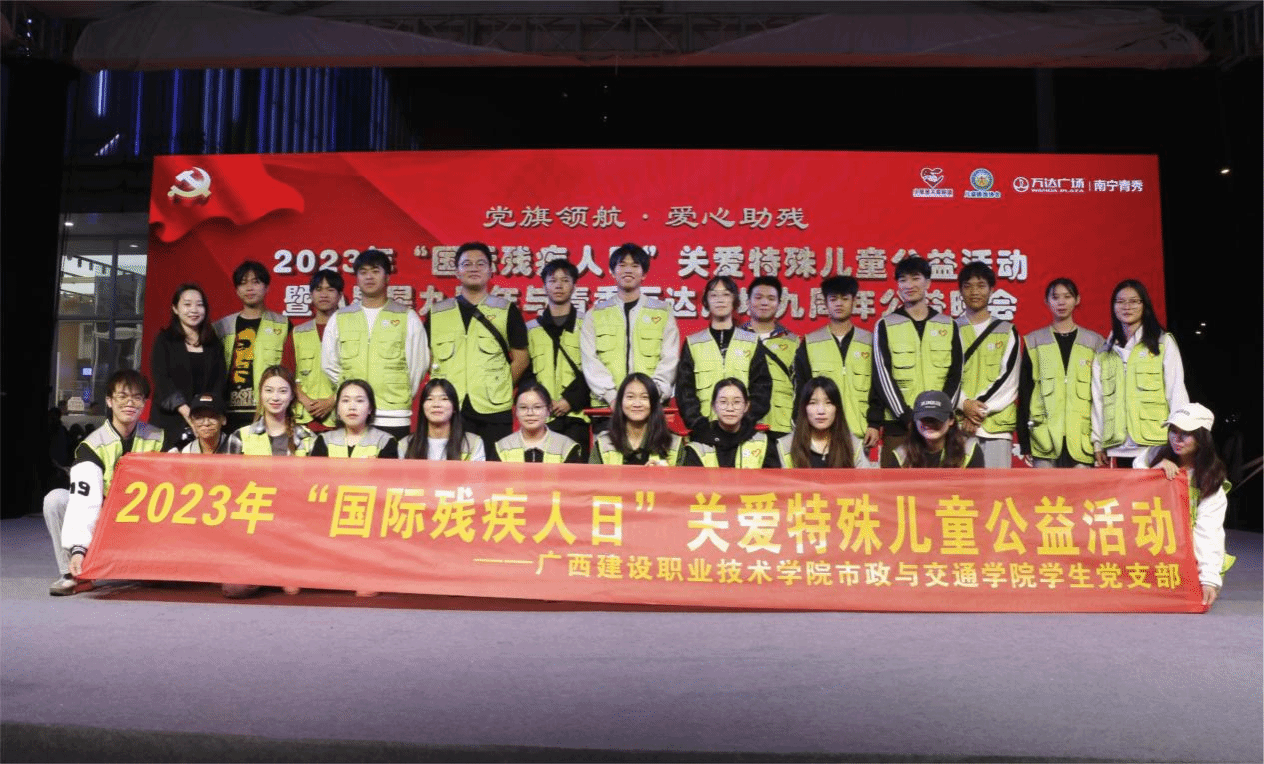 廣西建院12月9日訊(市政與交通學院 劉晗蕾)12月3日是第32個“國際殘疾人日”,市政與交通學院學生黨支部作為協(xié)辦單位組織26名學生入黨積極分子參與“黨旗領(lǐng)航 愛心助殘”2023年“國際殘疾人日”關(guān)愛特殊兒童公益活動暨小星星九周年與青秀萬達廣場九周年公益晚會。本次活動由南寧市兒童康復(fù)行業(yè)協(xié)會黨支部、廣西殘疾人福利基金會等單位主辦,南寧市小星星社會工作服務(wù)中心等單位承辦。