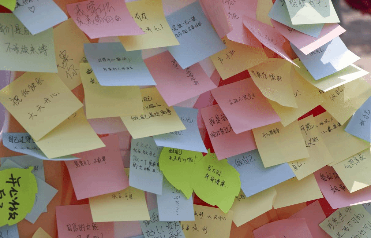 活動現場,同學們勇敢地撕掉在“人形立牌”上最觸動自己、最想擺脫的“標簽”,并在便利貼上寫下鼓勵自己的話,以美好的話語消除偏見。當粘貼在“人形立牌”上的標簽一張張的被撕掉,并貼上自己對未來美好的期望時,充分展現了同學們自我革新的勇氣。現場氛圍活躍,學生們情緒高漲。