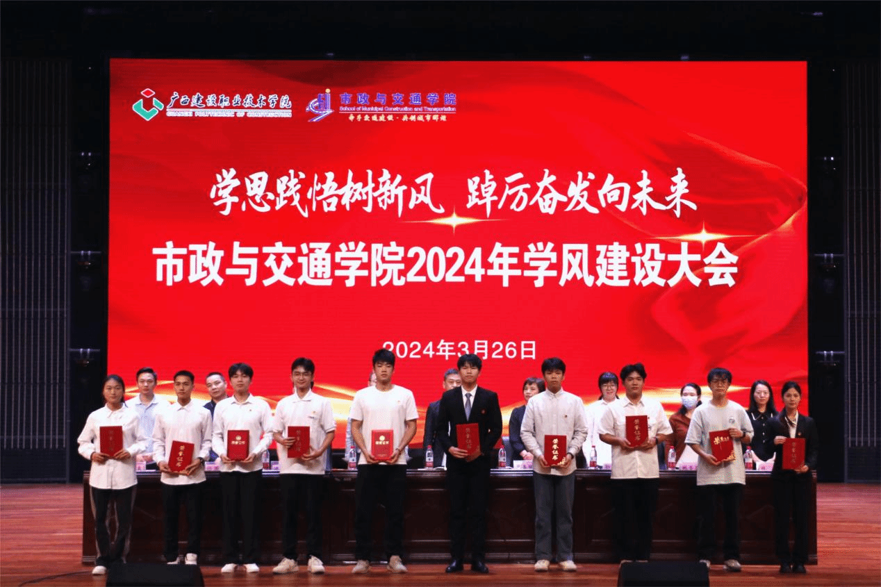 廣西建院3月28日訊(市政與交通學院 文/劉雪妮 圖/許大謙)為進一步加強市政與交通學院的學風建設,營造“比學趕幫超”的學習氛圍,助力大學生成長成才,市政與交通學院于3月26日下午在學校禮堂舉辦了“學思踐悟樹新風 踔厲奮發向未來”——2024年學風建設大會。市政與交通學院全體黨政領導、全體輔導員、專職教師,全體在校學生參加會議。會議由院長助理潘芳祿主持。
