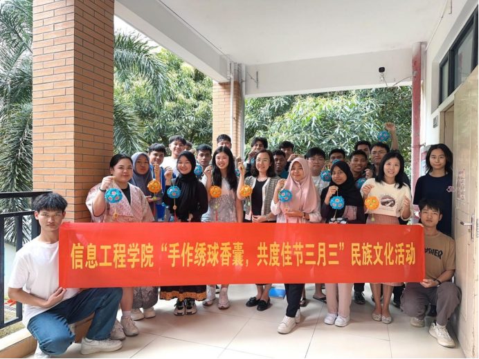 廣西建院4月10日訊(文/梁晶晶 圖/何鑫)4月9日下午,在“廣西三月三”傳統節日到來之際,為了讓留學生們更好地感受中國傳統文化,信息工程學院在向陽花工作室組織開展了“手作香囊繡球,共度三月三”民族文化體驗活動。學院黨總支書記、團總支書記、學院輔導員、17名留學生及學生代表參加了本次活動。