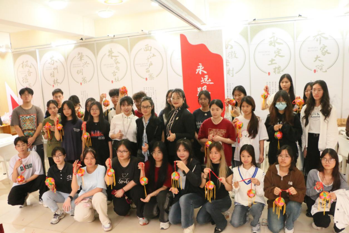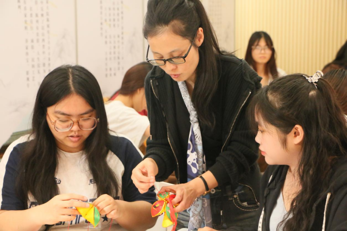 活動的最后,王秀芬老師還來到了知行工作室的活動場地之一——非遺工作坊,與同學們一起進行繡球制作的互動教學。在王老師的鼓勵和手把手的教學下,一顆顆手工繡球從同學們的手中制作了出來。這種親身體驗讓同學們對繡球有了更加深刻的理解,激發了學生對于非遺傳承的積極性和自信心。