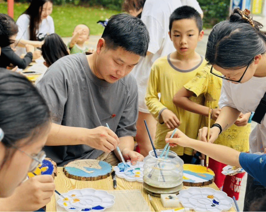 在木樁繪畫(huà)環(huán)節(jié),師生們?yōu)?/span>社區(qū)小朋友們準(zhǔn)備了各種顏色的顏料和畫(huà)筆,指導(dǎo)小朋友們?nèi)绾卧谀緲渡瞎蠢粘雒利惖膱D案和線條,讓原本不起眼的木樁變得色彩斑斕、充滿生機(jī)。小朋友們發(fā)揮想象力,盡情創(chuàng)作,一幅幅獨(dú)具特色的木樁繪畫(huà)作品應(yīng)運(yùn)而生。