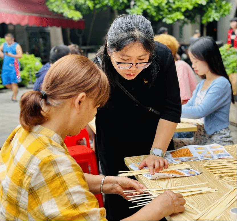 在竹編環(huán)節(jié),師生們耐心細(xì)致地指導(dǎo)社區(qū)居民們挑選合適的竹條,學(xué)習(xí)編織扇面的基礎(chǔ)技巧。社區(qū)居民們認(rèn)真聽(tīng)講,跟著步驟一步步操作,不久便編出了一個(gè)個(gè)小巧精致的扇子。拿著自己親手制作的扇子,他們臉上洋溢著自豪和喜悅的笑容。