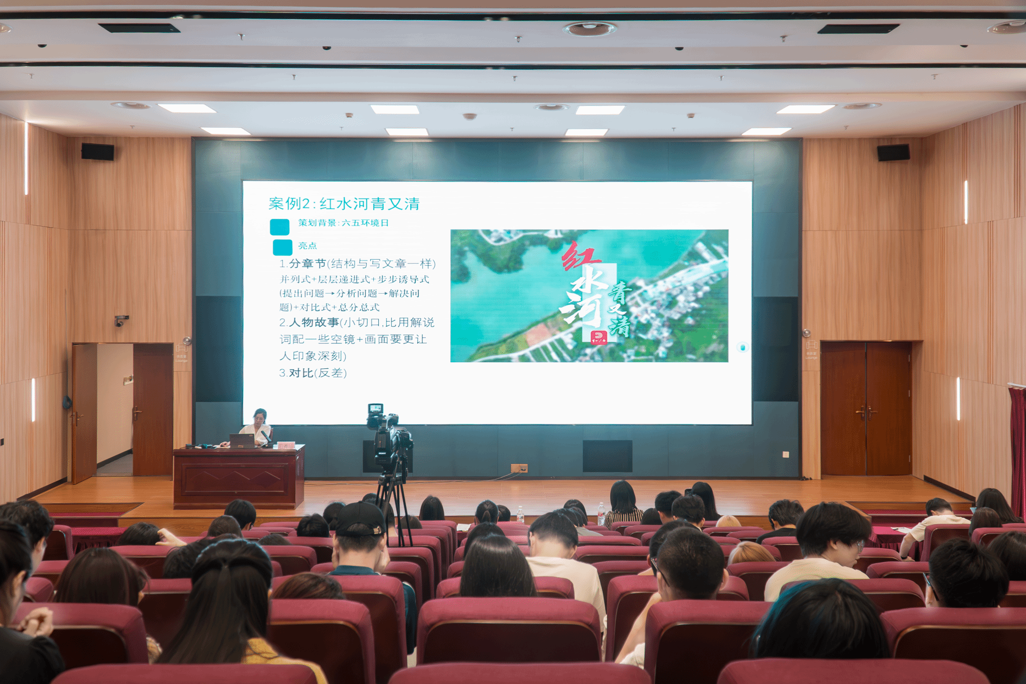 在兩個多小時的講座中,陽秀瓊主任結合自身豐富的實戰經驗,和大家分享了短視頻的創作理論及實踐經驗。她用淺顯易懂的語言介紹了短視頻的類型概念、短視頻策劃的關鍵要素、短視頻主題與風格匹配選擇、如何使用豐富的表現手法、參與度和互動性的提升等知識,分享了包括剪輯節奏與敘事結構、特效與動畫制作、音頻編輯與混音、色彩校正與調色等后期制作技巧。同時,她還結合當前年度熱門事件引導大家學會梳理尋找優秀的短視頻創意,并通過對《這就是廣西酸嘢》《紅水河青又清》等成功案例進行效果評估與數據分析,將專業“硬”知識變得生動有趣。整場講座內容豐富、案例鮮活、生動精彩,受到了師生的一致歡迎和好評。
