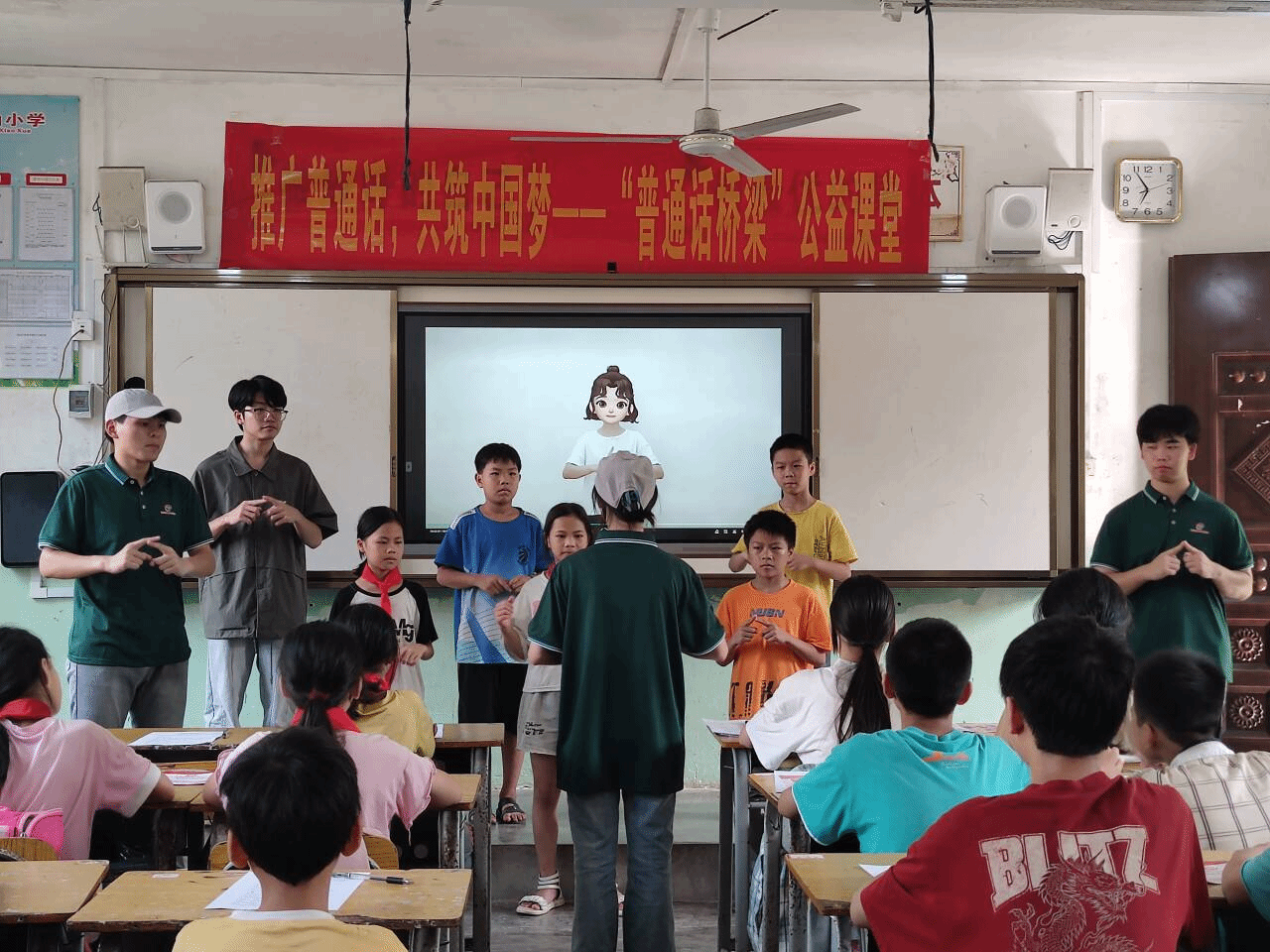 在“普通話橋梁”公益課堂中,實(shí)踐團(tuán)以“推廣普通話 弘揚(yáng)愛國(guó)情”為內(nèi)容主線,開展普通話知識(shí)講解、文化知識(shí)競(jìng)賽、繞口令、紅色經(jīng)典詩(shī)歌朗誦、歌曲表演、猜字謎等一系列豐富多彩的語(yǔ)言文字趣味活動(dòng),為小學(xué)生們帶來(lái)了一次別開生面的普通話知識(shí)推廣盛宴。孩子們積極參與,課堂氣氛活躍,生動(dòng)有趣,進(jìn)一步幫助小學(xué)生們?cè)鰪?qiáng)說(shuō)好普通話的意識(shí),提高語(yǔ)言文字實(shí)際應(yīng)用能力。