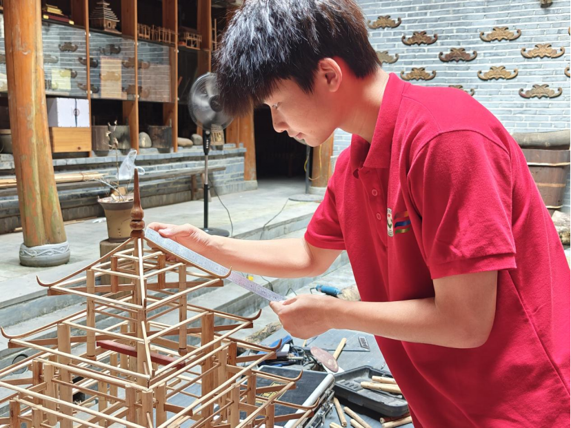 傳承團(tuán)成員還原搭建吊腳樓模型