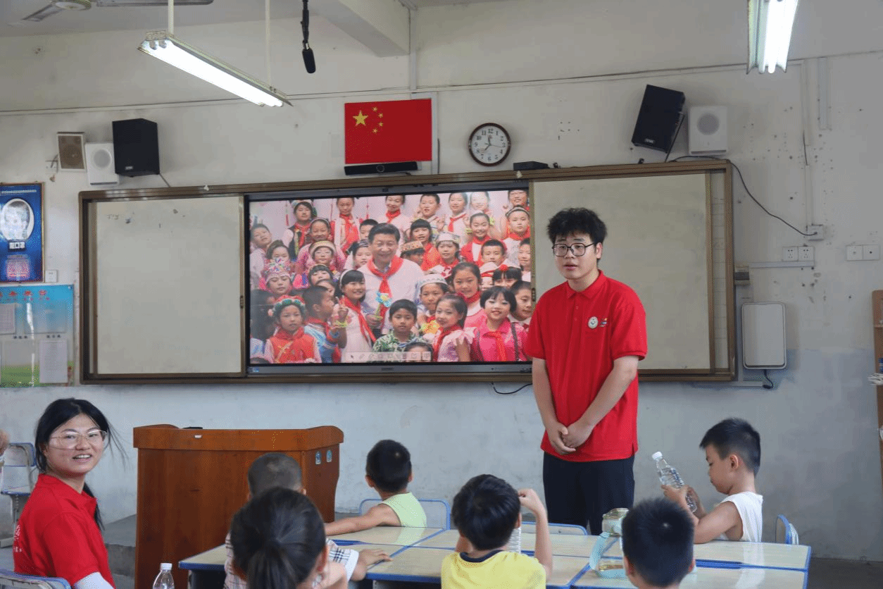 “一聲到,一生到!在部隊訓練的時光是我難忘的人生經(jīng)歷,希望通過我的故事激發(fā)同學們投身軍營保家衛(wèi)國的愛國情懷。”實踐團成員吳芋全是退役士兵,他化身“紅船精神講述人”,將自己參軍入伍的親身經(jīng)歷與教學點的同學們分享,用“小故事”引出“大道理”,為小朋友們種下一顆胸懷祖國勇于擔當?shù)姆N子。