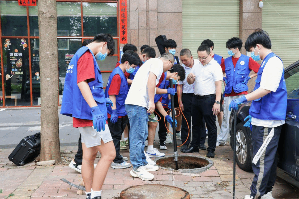 志愿服務(wù)的內(nèi)容分為下水管道檢測組和社區(qū)清潔組兩大板塊,同步在社區(qū)內(nèi)推進(jìn)志愿服務(wù)工作。下水管道安全檢測組的志愿者們一到社區(qū),迅速行動,在社區(qū)工作人員的指導(dǎo)下手持手電筒、檢測鏡、測量尺等專業(yè)工具,使用管道內(nèi)窺潛望鏡專業(yè)檢測儀器對小區(qū)的下水管道進(jìn)行了細(xì)致的排查。指導(dǎo)老師梁志武憑借豐富的專業(yè)經(jīng)驗,全過程指導(dǎo)志愿者進(jìn)行檢測操作及研究,一堂“行走”專業(yè)實踐課程就此展開。志愿者們一邊檢測,一邊詳細(xì)記錄發(fā)現(xiàn)的問題,包括堵塞、滲漏等潛在安全隱患的位置、類型和嚴(yán)重程度,并拍攝了照片以備后續(xù)處理。通過他們的認(rèn)真細(xì)致地工作,小區(qū)的下水管道得到了有效地排查和維護(hù),為居民的安全居住提供了有力保障。