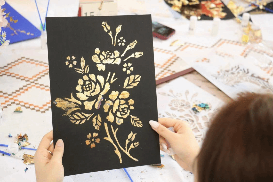 活動(dòng)中,學(xué)生充分發(fā)揮想象力和創(chuàng)造力,通過(guò)打線稿、涂膠水、貼金箔、掃金箔等步驟,將傳統(tǒng)工藝與現(xiàn)代審美相結(jié)合,以箔為墨,繪制出一幅幅精美絕倫的燒箔畫(huà)作品。燒箔畫(huà)制作不僅展現(xiàn)了燒箔畫(huà)獨(dú)特的藝術(shù)魅力,還激發(fā)了學(xué)生們對(duì)中華優(yōu)秀傳統(tǒng)文化的興趣和熱愛(ài)。