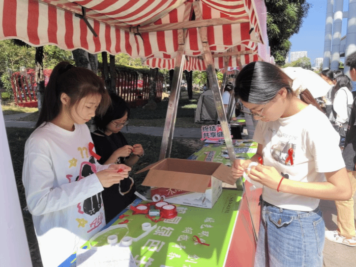 志愿者與同學(xué)們一起制作紅絲帶