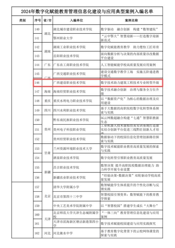 廣西建院12月14日訊(土木工程學院 龐毅玲)12月5日,教育部教育管理信息中心公布了2024年數字化賦能教育管理信息化建設與應用典型案例入編名單,我校土木工程學院龐毅玲教授負責的《數字技術助力建筑工程技術專業轉型升級》案例成功入編。該數字化應用案例由該院龐毅玲、葛春雷、蒙文流3位教師完成撰寫。