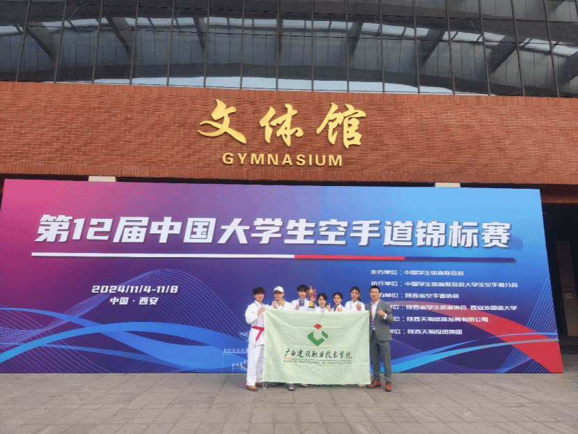 廣西建院11月8日訊(人文教育學院 文/梁炎 圖/陸松)11月6日至8日,由中國大學生體育協會主辦,中國大學生體育協會空手道分會執行,陜西省空手道協會承辦,陜西省學生體育協會、西安外國語大學協辦的第12屆中國大學生空手道錦標賽在西安舉行,我校空手道代表隊在乙組(高職高專組)混合團體型項目中喜獲第三名。