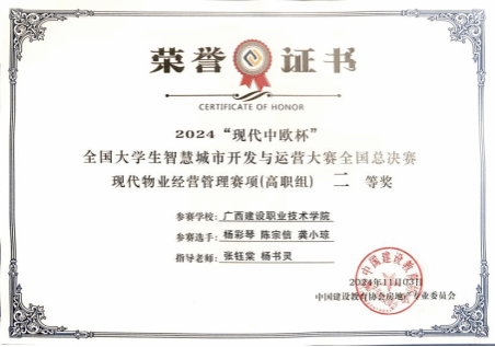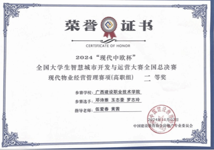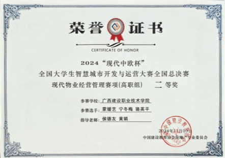廣西建院11月5日訊(管理工程學院 侯德友)11月3日,由中國建設教育協(xié)會指導、中國建設教育協(xié)會房地產(chǎn)專業(yè)委員會主辦,石家莊學院和北京現(xiàn)代中歐軟件開發(fā)有限公司聯(lián)合承辦的2024“現(xiàn)代中歐杯”全國大學生智慧城市開發(fā)運營大賽全國總決賽在石家莊學院舉辦。經(jīng)過激烈角逐,由我校管理工程學院現(xiàn)代物業(yè)管理專業(yè)9位學生組成的三支隊伍均獲得現(xiàn)代物業(yè)經(jīng)營管理賽項(高職組)二等獎。