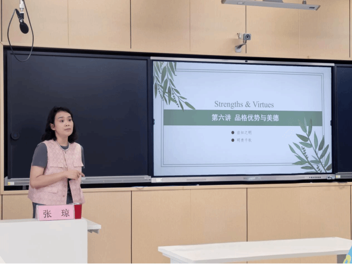 張瓊老師以“積極心理視角下的大學(xué)生心理健康教育”為主題進(jìn)行教學(xué)設(shè)計(jì)。上午,她圍繞“品格優(yōu)勢(shì)與美德”開展“自我意識(shí)”主題的示范授課。課程以“蓬勃人生的PERMA理論”導(dǎo)入,設(shè)計(jì)“自知之明”授課環(huán)節(jié)講解:人為什么要認(rèn)識(shí)自己。用“明貴千秋”授課環(huán)節(jié)講解如何認(rèn)識(shí)自己,最后解析“美德六維度”幫助學(xué)生挖掘自身能力促進(jìn)心理成長(zhǎng)。