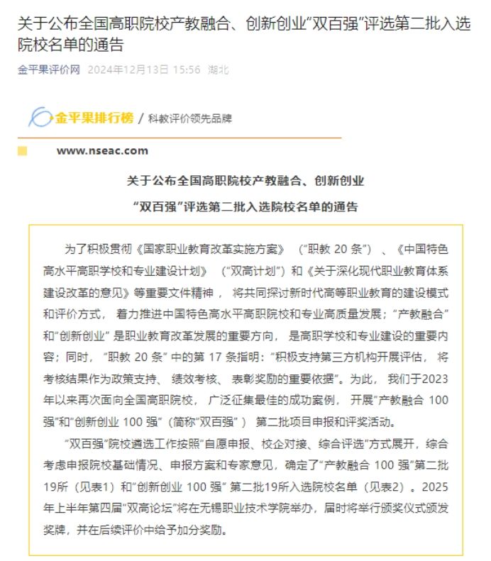 學校入選全國高職院校第二批產(chǎn)教融合、創(chuàng)新創(chuàng)業(yè)“雙百強”院校