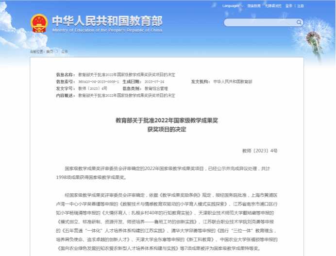 據(jù)悉,國(guó)家級(jí)教學(xué)成果獎(jiǎng)每四年評(píng)選一次,是教育部為了獎(jiǎng)勵(lì)取得教學(xué)成果的集體和個(gè)人,鼓勵(lì)教育工作者從事教育教學(xué)研究,提高教學(xué)水平和教育質(zhì)量而設(shè)立的最高級(jí)別的獎(jiǎng)勵(lì)。