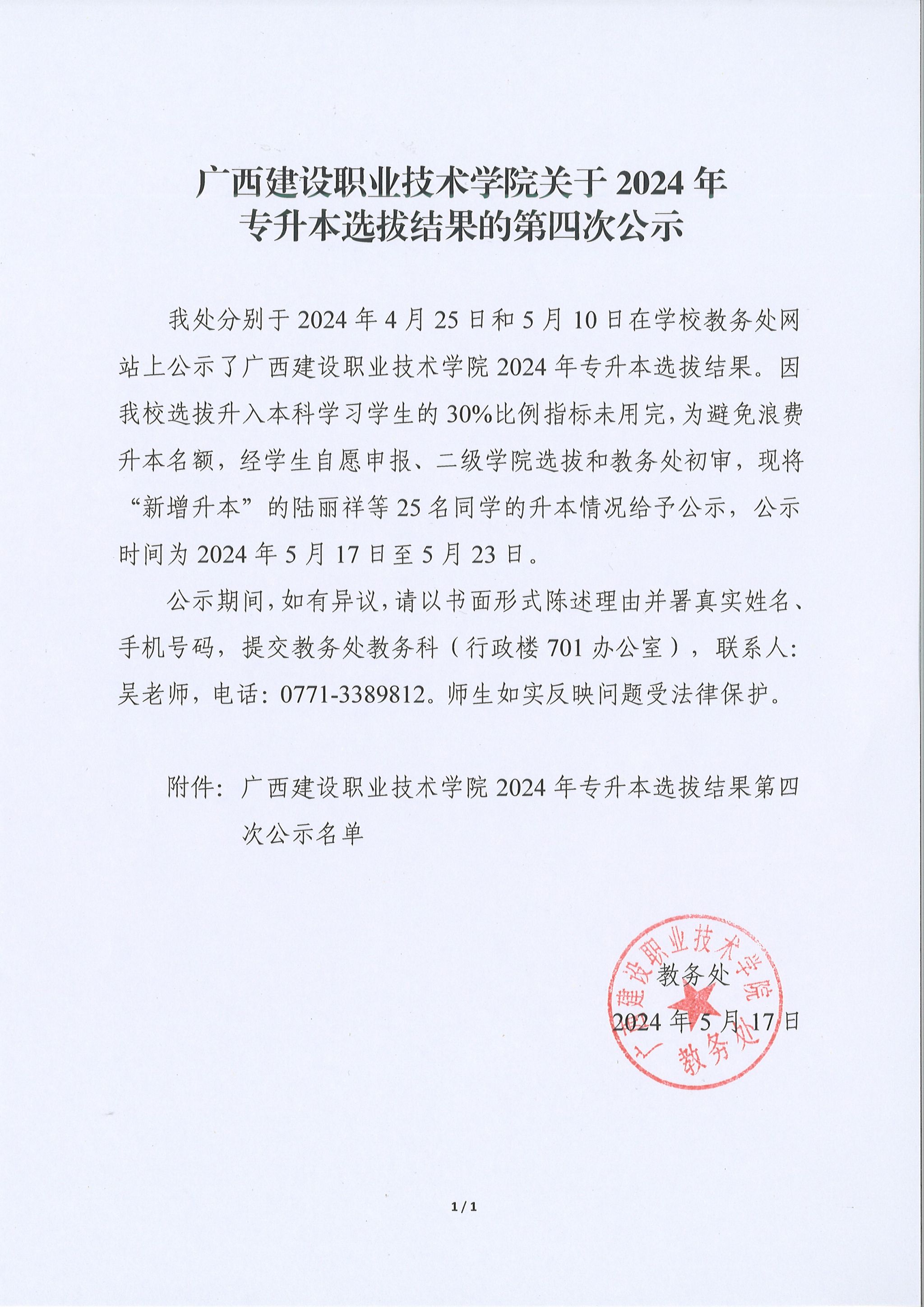 廣西建設職業技術學院2024年專升本選拔結果第四次公示名單
