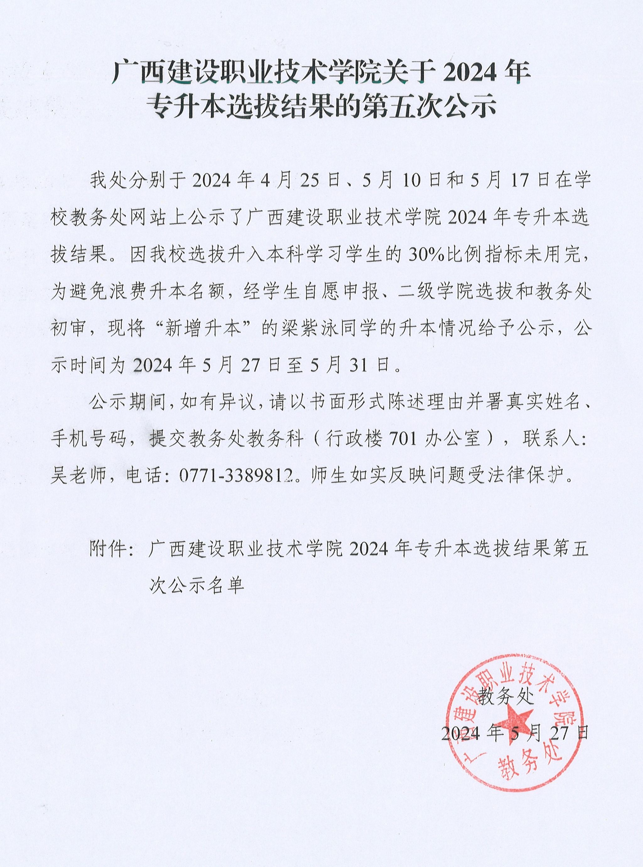 廣西建設職業技術學院2024年專升本選拔結果第五次公示名單