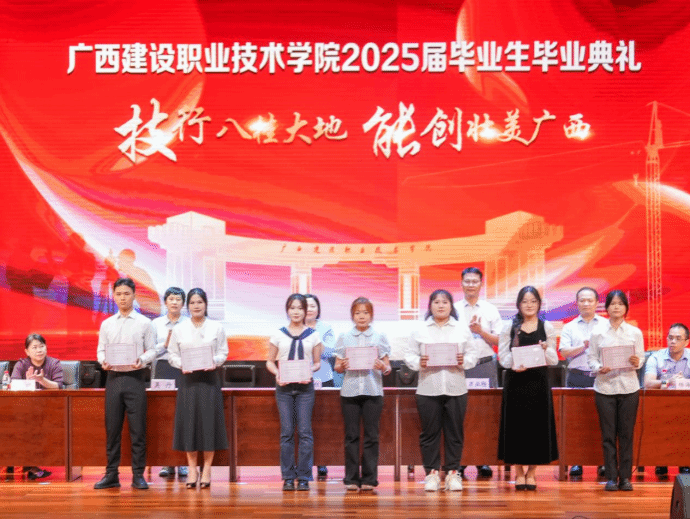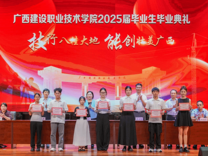 會上宣讀了自治區級、校級優秀畢業生表彰文件。土木工程學院蘇雯等69名畢業生榮獲“2025屆廣西壯族自治區普通高等教育優秀畢業生”稱號,建筑規劃學院黃秋鳳等607名同學榮獲“廣西建設職業技術學院2025屆優秀畢業生”榮譽稱號。與會領導為受表彰的優秀畢業生代表頒發榮譽證書。