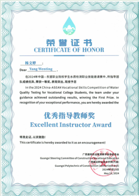 4.7教材主編楊文婷老師指導學生應用教材情境一水質評價技能內容,榮獲2024年中國-東盟職業水質檢測職業技能邀請賽一等獎