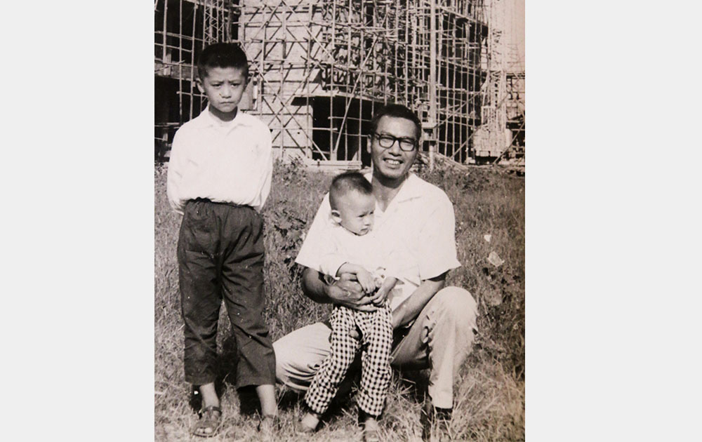 1978年許崇奭老師攜兩子在學校北教學樓前合影
