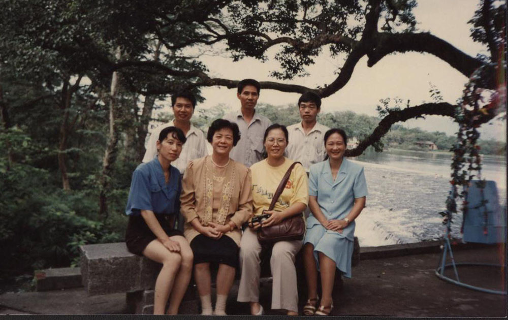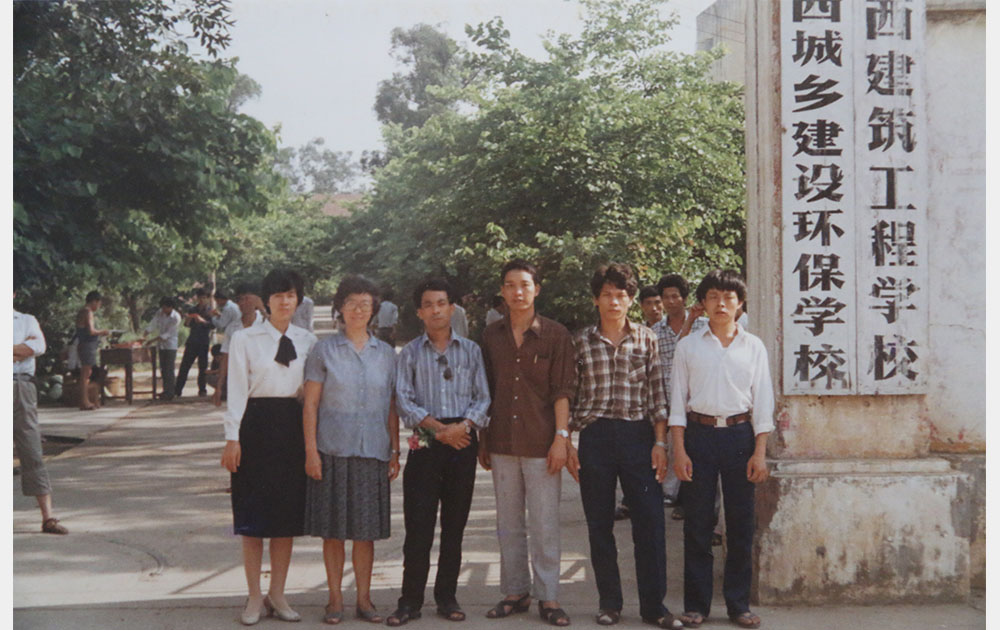 80年代鮑若玫老師(左二)與79級學生在校門前合影