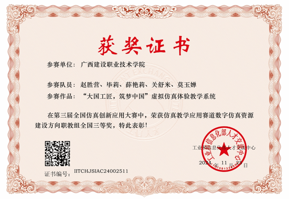 廣西建院12月20日訊(馬克思主義學院 宋佳雄)近日,由國家工業和信息化部主辦的2024年全國仿真創新應用大賽全國總決賽在西北工業大學落下帷幕。我校思政課教師團隊的作品《“大國工匠,筑夢中國”虛擬仿真體驗教學系統》(團隊成員:趙勝營、畢莉、薛艷莉、關舒米、莫玉嬋)榮獲仿真教學應用賽道數字仿真資源建設方向職教組全國三等獎。據悉,全國仿真應用大賽是我國仿真技術創新應用領域高水平的競賽,旨在推動仿真技術的創新和運用。...