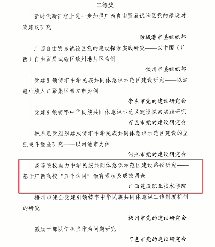 廣西建院1月13日訊(馬克思主義學院 宋佳雄)近日,廣西黨的建設研究會公布了2024年度重點課題優秀調研成果,我校教師黨員周豐生同志申報的《高等院校助力中華民族共同體意識示范區建設路徑研究——基于廣西高校“五個認同”教育現狀及成效調查》榮獲二等獎。此次評選活動中,全區共認定高質量研究成果一等獎9個、二等獎17個、三等獎21個,優秀獎10個。多年來,我校馬克思主義學院堅持以習近平新時代中國特色社會主義思想為指導,全面貫徹落實習近平總書記關于廣西工作論述的重要要求,...