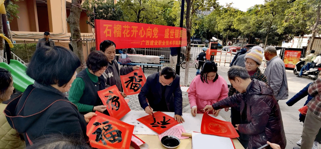 在新春佳節(jié)即將來(lái)臨之際,為營(yíng)造濃厚的節(jié)日氛圍,傳承和弘揚(yáng)中華優(yōu)秀傳統(tǒng)文化,近日,離退休黨總支在建苑小區(qū)開展“送福送春聯(lián)”主題便民志愿服務(wù)活動(dòng),用最具“年味兒”的方式,向退休教職工和群眾送祝福送服務(wù)。活動(dòng)現(xiàn)場(chǎng),艷陽(yáng)高照。退休教職工中的書法愛好者們從容蘸墨、揮毫,筆鋒游走間,把對(duì)新年的祝福寫進(jìn)一行行俊秀蒼勁的書法中,把對(duì)新年的期盼寫進(jìn)一句句墨香四溢的語(yǔ)句間。學(xué)校副校長(zhǎng)兼工會(huì)主席謝東同志在現(xiàn)場(chǎng)揮毫潑墨,筆走龍蛇,...