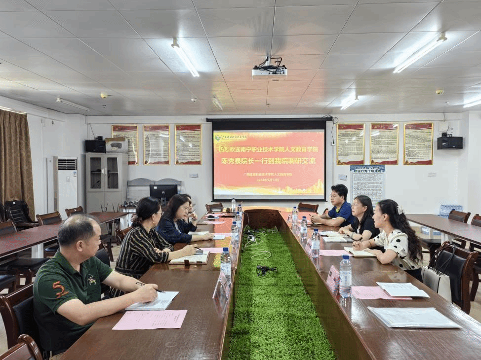 廣西建院5月14日訊(人文教育學院 莫壯國)5月13日,南寧職業(yè)技術學院人文教育學院陳秀泉院長一行4人到我校人文教育學院進行調研交流。我校人文教育學院黨總支書記楊颯颯,副院長羅新華參加了此次交流活動。雙方就推廣使用國家通用語言文字工作以及相關問題進行熱烈友好的討論。楊颯颯書記對陳秀泉院長一行的到來表示歡迎,介紹了學院的基本情況,并重點介紹了學院近年來推廣使用國家通用語言文字工作的做法。她從制度保障、組織實施、...