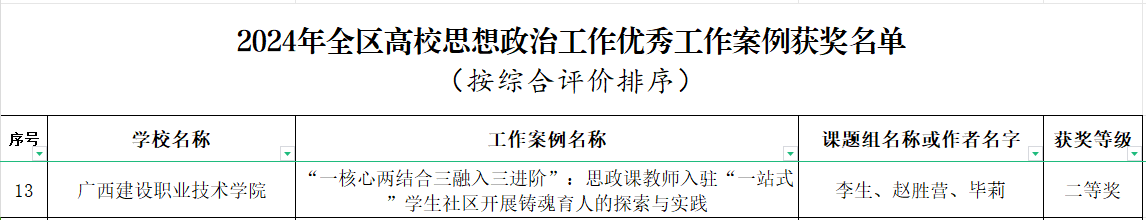 廣西建院5月15日訊(馬克思主義學院 曹桃) 近日,自治區教育廳公布了2024年全區高校思想政治工作優秀調研報告和工作案例獲獎名單,我校榮獲優秀工作案例二等獎1項,優秀調研報告三等獎2項。近年來,我校始終堅持以習近平新時代中國特色社會主義思想為指導,深入學習貫徹習近平總書記對學校思政課建設作出的重要指示精神,堅持思政課建設與黨的創新理論武裝同步推進,守正創新推動思政課建設內涵式發展。下一步,我校將以更高標準、...