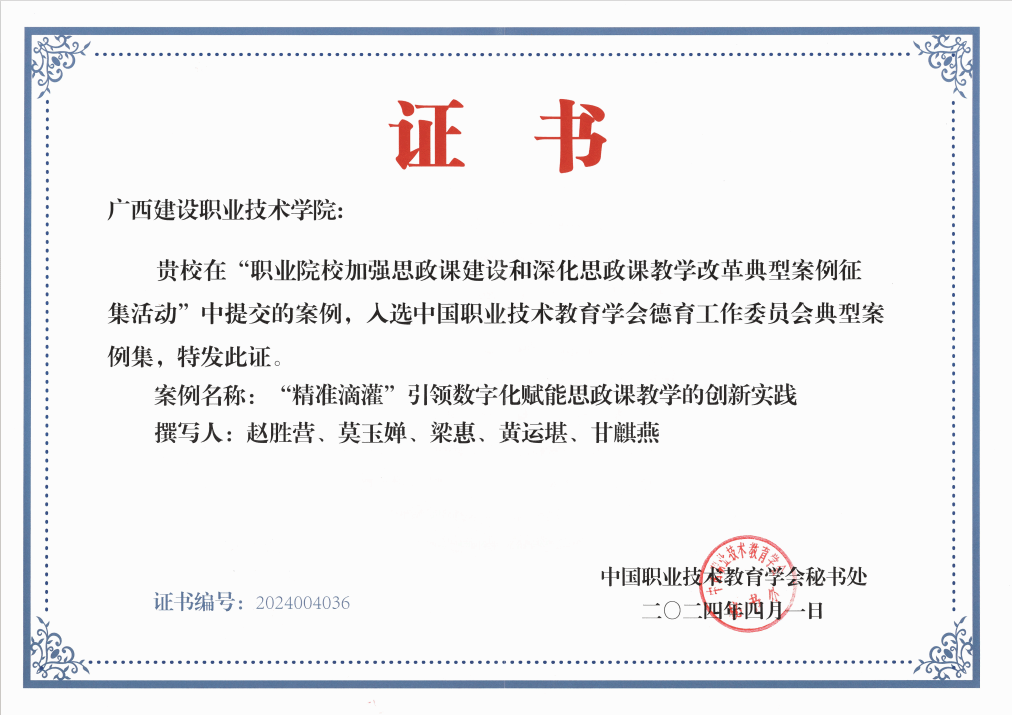 廣西建院5月18日訊(馬克思主義學院 莫玉嬋)近日,中國職業技術教育學會公布了職業院校加強思政課建設和深化思政課教學改革典型案例征集活動評選結果。我校思政課教學改革案例《“精準滴灌”引領數字化賦能思政課教學的創新》入選中國職業技術教育學會德育工作委員會典型案例集。近年來,我校始終堅持以習近平新時代中國特色社會主義思想為指導,貫徹習近平總書記對學校思政課建設作出的重要指示精神,落實立德樹人根本任務,在思政課教學改革方面取得了顯著成效。...
