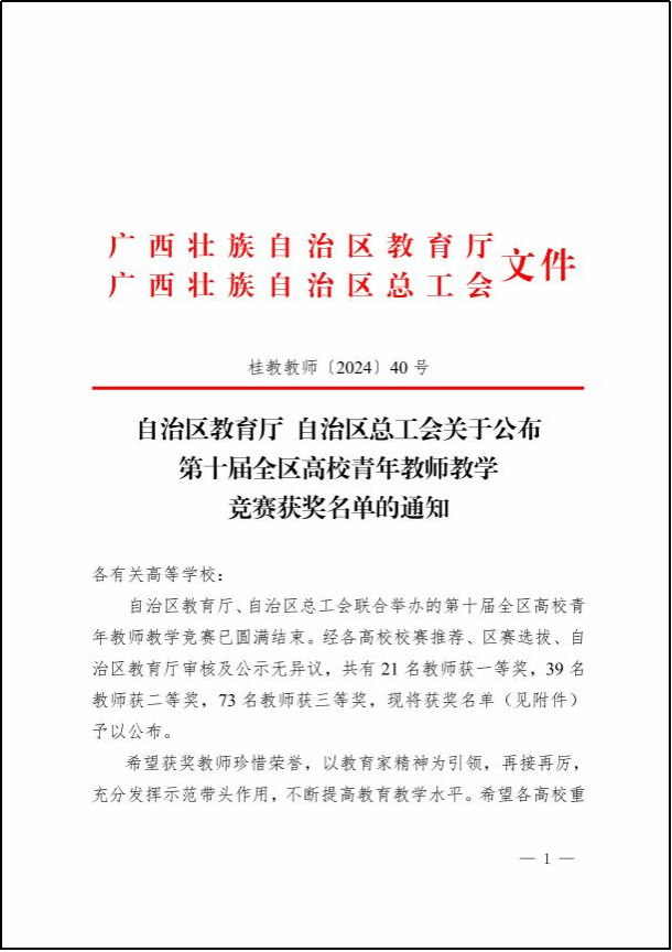 廣西建院6月25日訊(教師發展中心 張望)近日,由自治區教育廳、自治區總工會聯合舉辦的第十屆全區高校青年教師教學競賽在廣西師范大學圓滿落下帷幕。來自全區75所高校259名教師參加初賽,58所高校的134名教師晉級決賽。經過激烈角逐,我校馬克思主義學院教師萬秀熠榮獲思政組一等獎、人文教育學院教師林怡榮獲理科組一等獎、市政與交通學院教師宋柳榮獲工科組二等獎。學校高度重視此次比賽,教師發展中心、工會等部門精心組織與配合,...