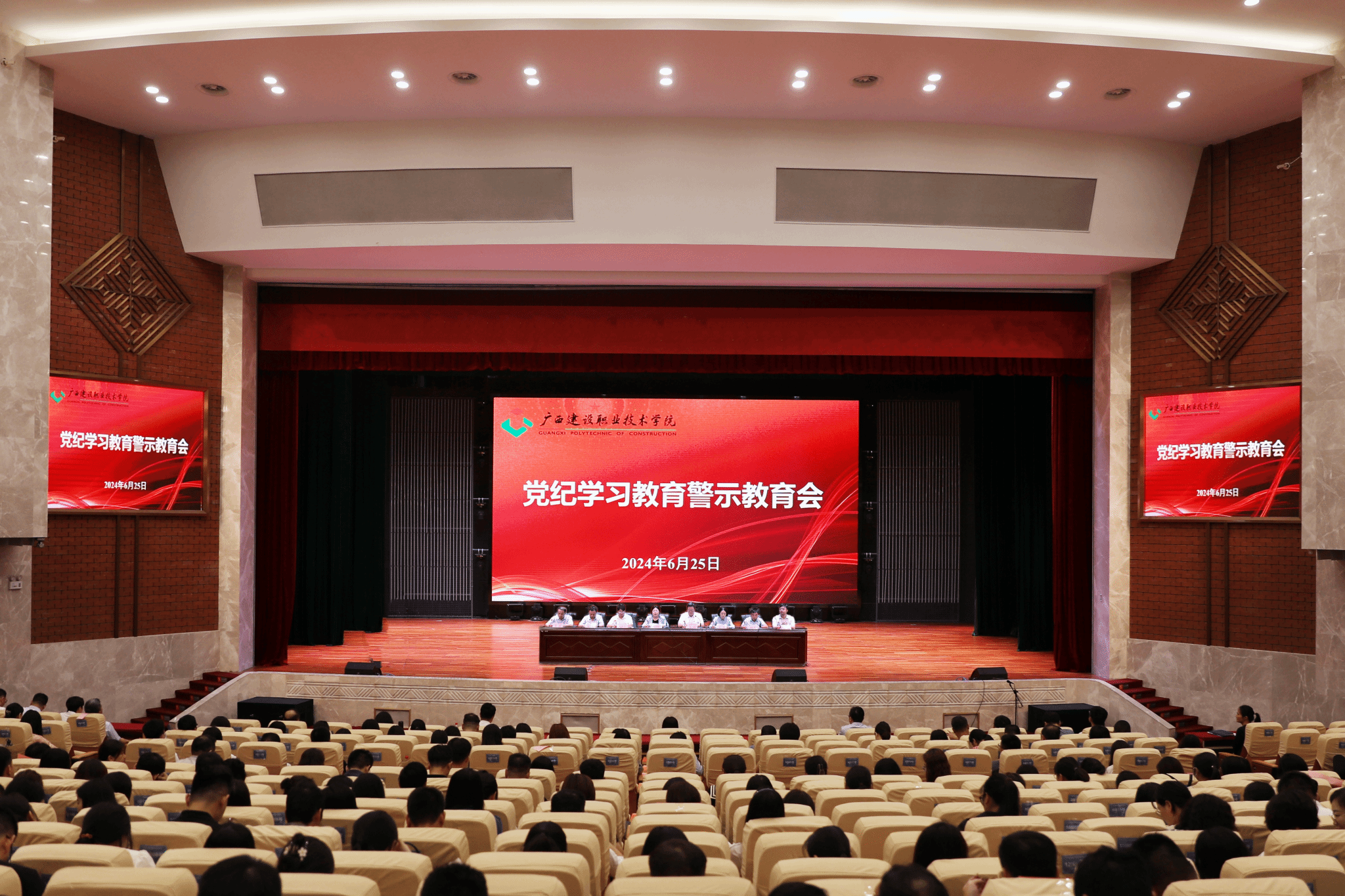 廣西6月26日訊(文/紀委辦公室 李雪萍 圖/黨委宣傳部 韋植巍 記者團 李承宏)為深入學習貫徹習近平總書記關于全面加強黨的紀律建設的重要論述,認真落實黨中央和自治區黨委關于黨紀學習教育的部署要求,6月25日,黨紀學習教育警示教育會在學校禮堂召開。學校領導班子成員,黨委委員,紀委委員,各二級學院黨政領導班子成員、各職能部門正副職負責人,校屬企業班子成員,教職工黨員、離退休黨員參加了會議。會上,與會人員集體觀看了由自治區紀委監委制作的黨紀學習教育警示教育系列專題片《...