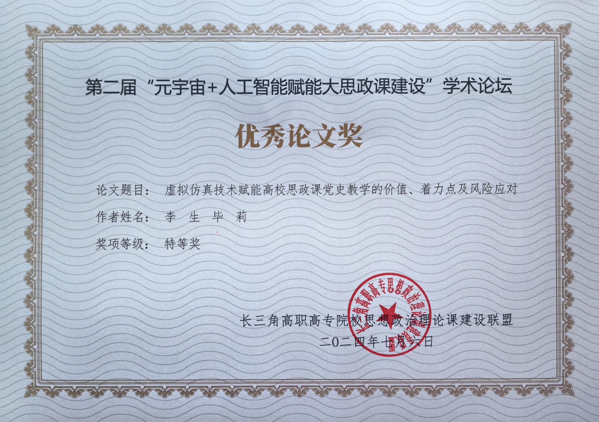 廣西建院7月9日訊( 馬克思主義學院 莫玉嬋)近日,第二屆“元宇宙+人工智能賦能大思政課建設”學術(shù)論壇優(yōu)秀征文活動評選結(jié)果揭曉。我校馬克思主義學院思政課教師在評選活動中榮獲特等獎1項、一等獎1項和三等獎1項。其中,李生、畢莉撰寫的《虛擬仿真技術(shù)賦能高校思政課黨史教學的價值、著力點及風險應對》榮獲特等獎;莫玉嬋撰寫的《新時代信息技術(shù)與高校思政課教學融合的現(xiàn)實審思與實現(xiàn)路徑》榮獲一等獎;范崢撰寫的《“元宇宙+職教”...