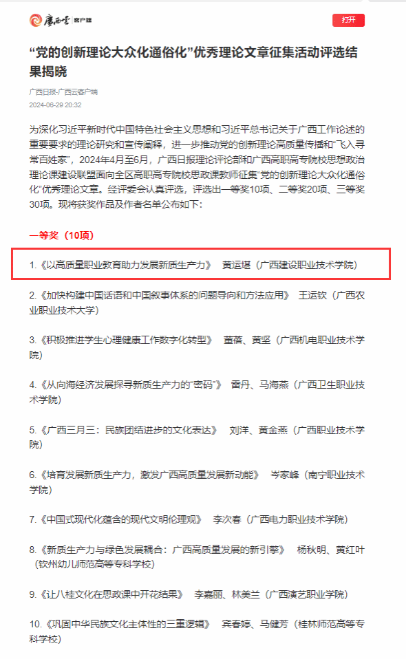 廣西建院7月5日訊(馬克思主義學院 曹桃)近日,“黨的創(chuàng)新理論大眾化通俗化”優(yōu)秀理論文章征集活動評選結(jié)果揭曉,我校思政課教師在評選活動中榮獲一等獎1項,二等獎2項、三等獎1項。其中,黃運堪撰寫的《以高質(zhì)量職業(yè)教育助力發(fā)展新質(zhì)生產(chǎn)力》榮獲一等獎,江紫鳳撰寫的《職業(yè)教育如何賦能新質(zhì)生產(chǎn)力》、李倩撰寫的《把握“用真理的強大力量引導學生”的核心要義》分別榮獲二等獎,陳志芳撰寫的《以習近平文化思想育高職院校好青年》...