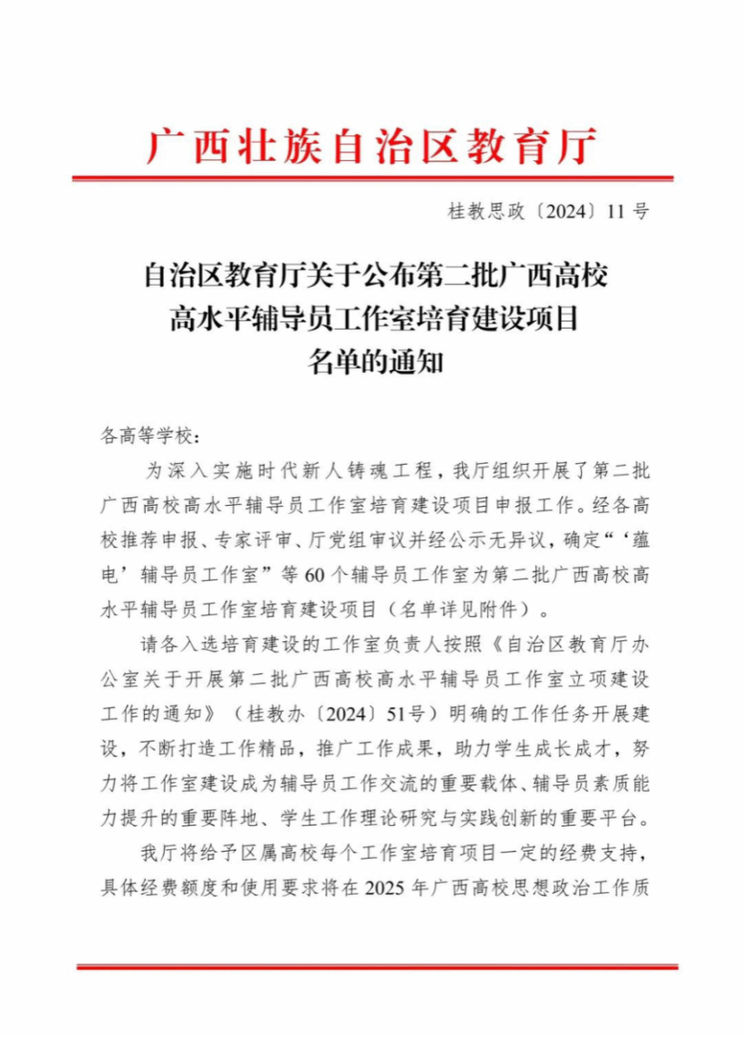 廣西建院8月1日訊(“職”為你工作室 揚(yáng)帆工作室)近日,自治區(qū)教育廳公布第二批廣西高校高水平輔導(dǎo)員工作室培育建設(shè)項(xiàng)目名單,我校設(shè)備與環(huán)境學(xué)院輔導(dǎo)員徐靜主持的“職”為你工作室和土木工程學(xué)院輔導(dǎo)員馮光帆主持的揚(yáng)帆工作室雙雙入選。 立項(xiàng)文件“職”為你工作室于2022年6月成立,致力于在“雙創(chuàng)”實(shí)戰(zhàn)中構(gòu)建師生成長共同體。目前,已建成了4500㎡的以工作室為中心,創(chuàng)意創(chuàng)業(yè)集市、生活技能超市為實(shí)踐基地的“一核兩翼”雙創(chuàng)社區(qū)空間。...