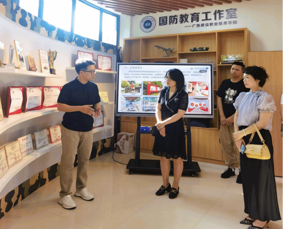 廣西建院7月26日訊(文/謝一玲 圖/謝一玲)7月26日,自治區(qū)退役軍人培訓(xùn)中心培訓(xùn)部郭雪霜部長一行到我校調(diào)研交流國防教育工作和退役復(fù)學(xué)大學(xué)生的培訓(xùn)學(xué)習(xí)情況。我校繼續(xù)教育學(xué)院副院長龔劍,黨委學(xué)生工作部(黨委武裝部、學(xué)生工作處)學(xué)生科,國防教育工作室負(fù)責(zé)人及工作室成員代表參加交流。 參觀國防教育工作室 國防教育工作室張懸鵬老師向到訪的領(lǐng)導(dǎo)一行匯報(bào)了工作室的建設(shè)情況。學(xué)校黨委高度重視國防教育與武裝征兵工作。在學(xué)校黨委的精心指導(dǎo)下,...