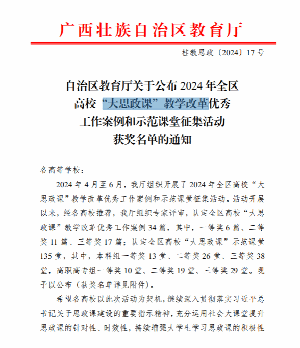 廣西建院9月6日訊(馬克思主義學院 宋佳雄)近日,自治區教育廳公布了2024年全區高校“大思政課”教學改革優秀工作案例和示范課堂征集活動獲獎名單。我校馬克思主義學院教師梁惠、莫玉嬋的作品《數字化賦能“大思政課”實踐教學范式的創新與實踐》榮獲“優秀工作案例”一等獎,毛娟翠、張博聞、畢莉的作品《傳承八桂鄉情,構筑中華民族共有精神家園》榮獲高職高專組“示范課堂”二等獎,黃哲、梁曉祺、梁惠的作品《中國式現代化視域下壯美廣西的甜蜜事業》...