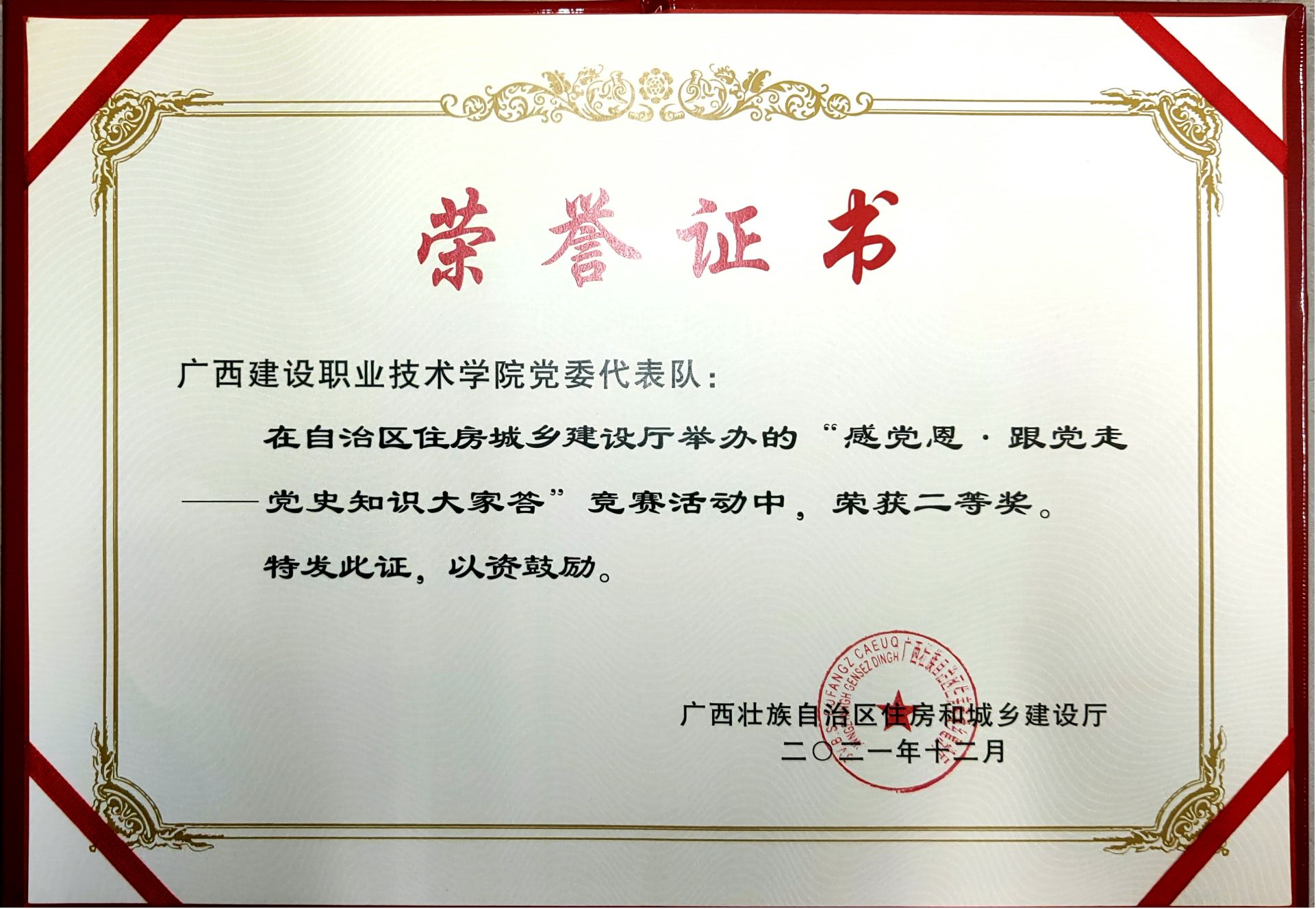 廣西建院24日訊(黨委宣傳部 莫智婷)12月22日,由自治區住房城鄉建設廳組織開展的“感黨恩?跟黨走——黨史知識大家答”競賽活動在廣西建設大廈25樓舉行。我校派出由馬克思主義學院黃海蓮、李恒鳳、李琴、張小冬,土...
