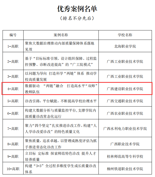 廣西建院12月28日訊(質量管理辦公室 覃珊珊)近日,自治區教育廳下發《關于公布職業院校內部質量保證體系診斷與改進制度建設優秀案例的通知》,我校案例《“數據驅動‘兩鏈’融合 打造高水平‘雙師’教師隊伍”...