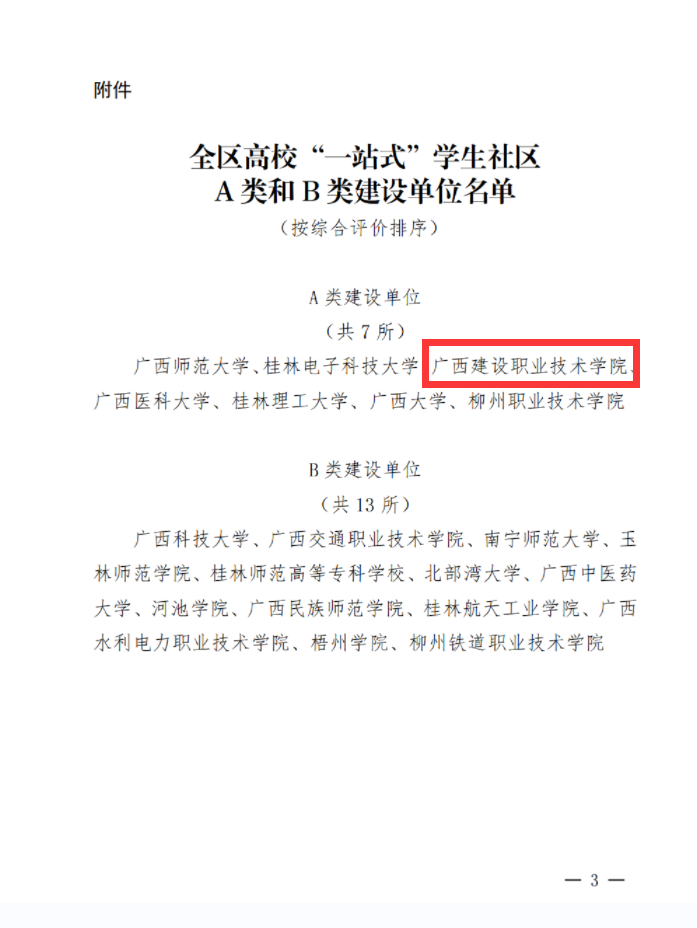 廣西建院10月28日訊(黨委學生工作部 宋霞)10月25日,廣西教育廳公布第一批全區高校“一站式”學生社區建設A類和B類單位名單,我校以全區高校第三、高職高專第一的綜合評價排名,獲評A類建設單位。本次認定工作...